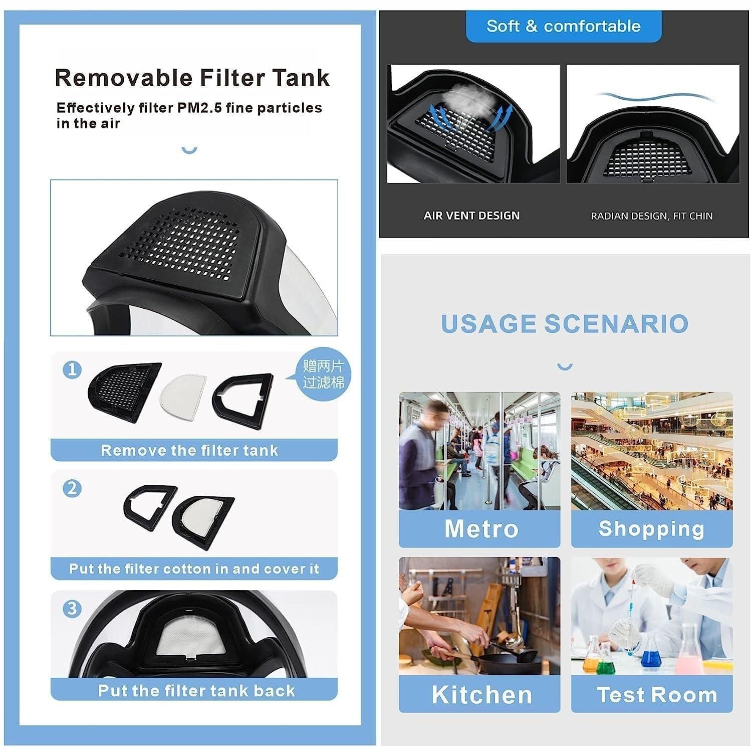 - Offers full face coverage, protecting against droplets, dust, and other airborne particles. The mask is designed to fit snugly, providing a secure seal while maintaining comfort.